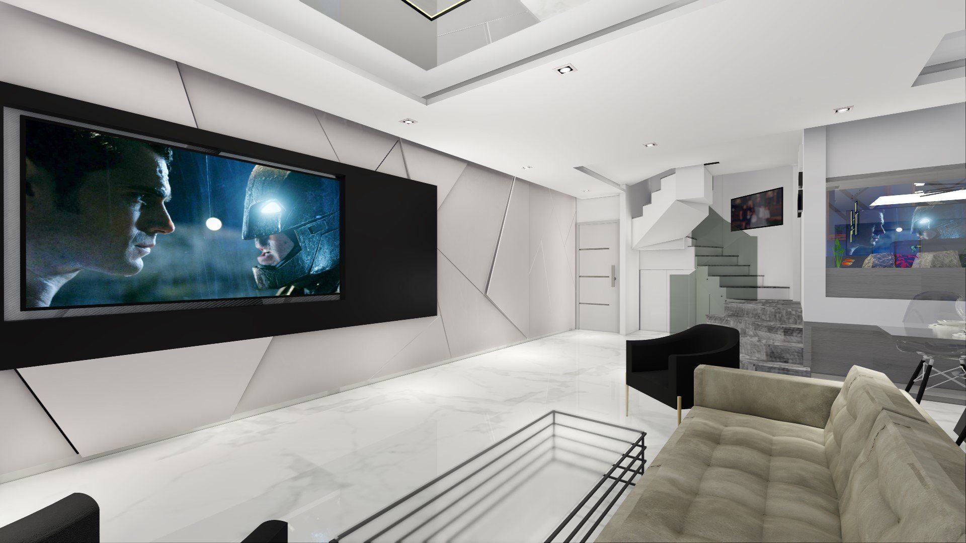 לסלון יצרנו פרט של חיפוי קיר בטון מדהים ביופיו ובישלוב של עץ צבוע בשחור אפוקסי למיקום הטלויזיה.